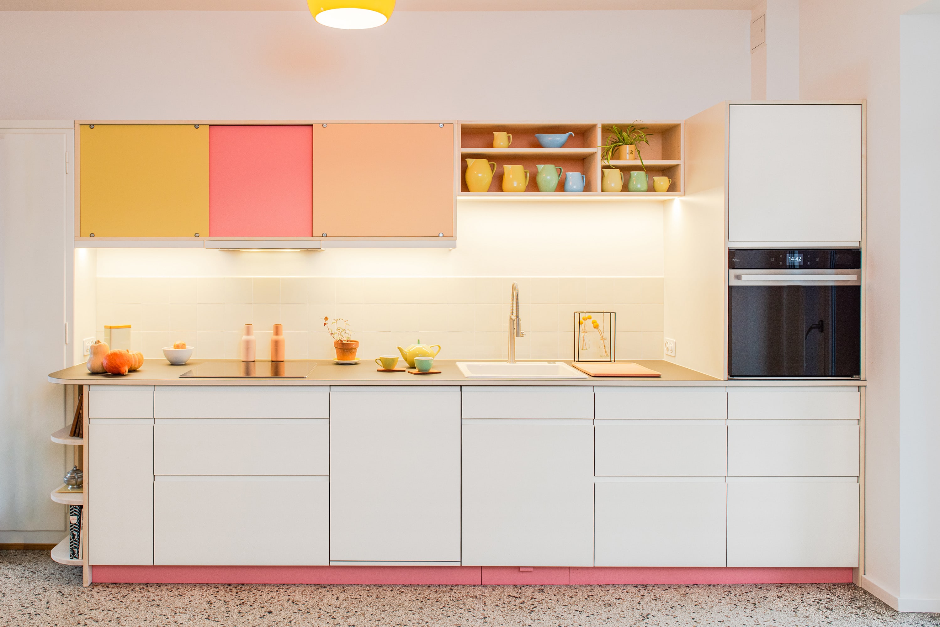Diese Küche besticht durch harmonisch eingesetzte Farbflächen, kombiniert mit einem zurückhaltenden Unterbau in eierschalenweiss. Die Fronten in gelb, pfirsich und rosa setzen warme Farbakzente, passend zum Terrazzoboden.