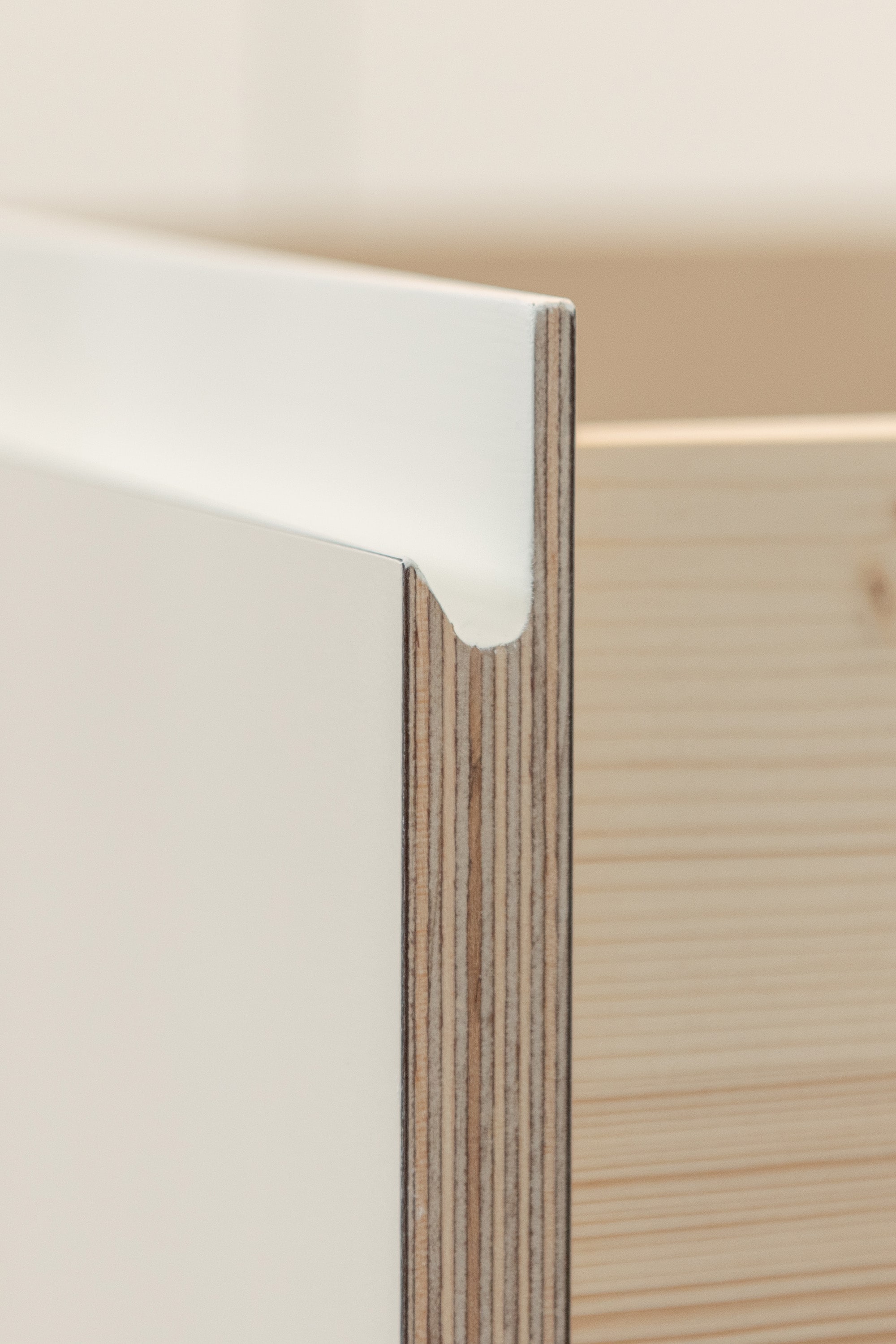 In der Materialität ergibt sich ein ausgewogenes Spiel zwischen den harten, glatten Kunstharzfronten und dem weichen, sanften Linoleum der Arbeitsplatte.