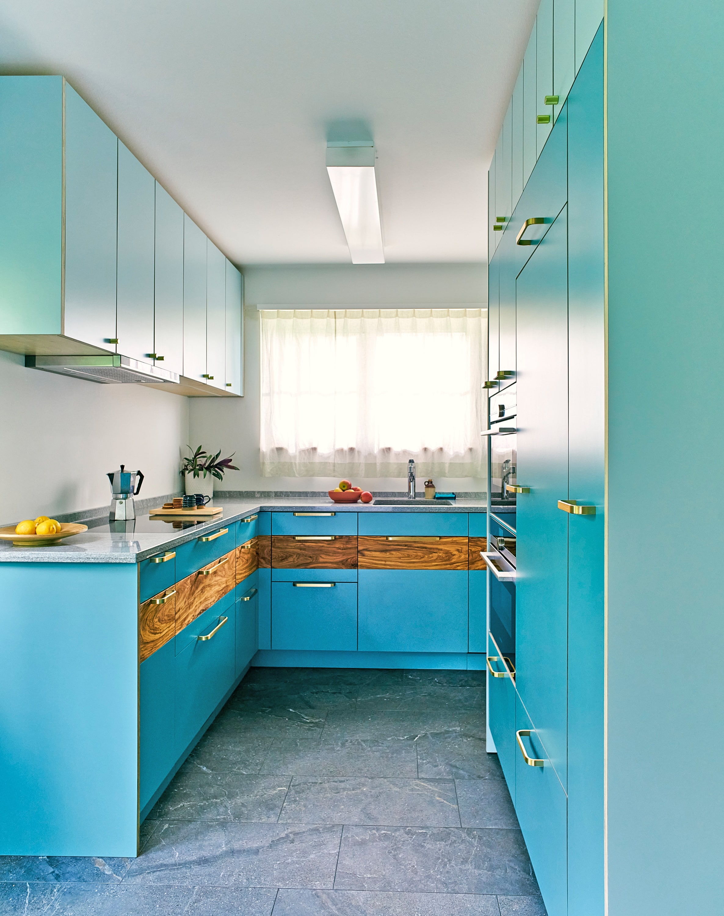 Die schmalen, hellen Fronten der Oberschränke ziehen den Raum optisch in die Höhe.