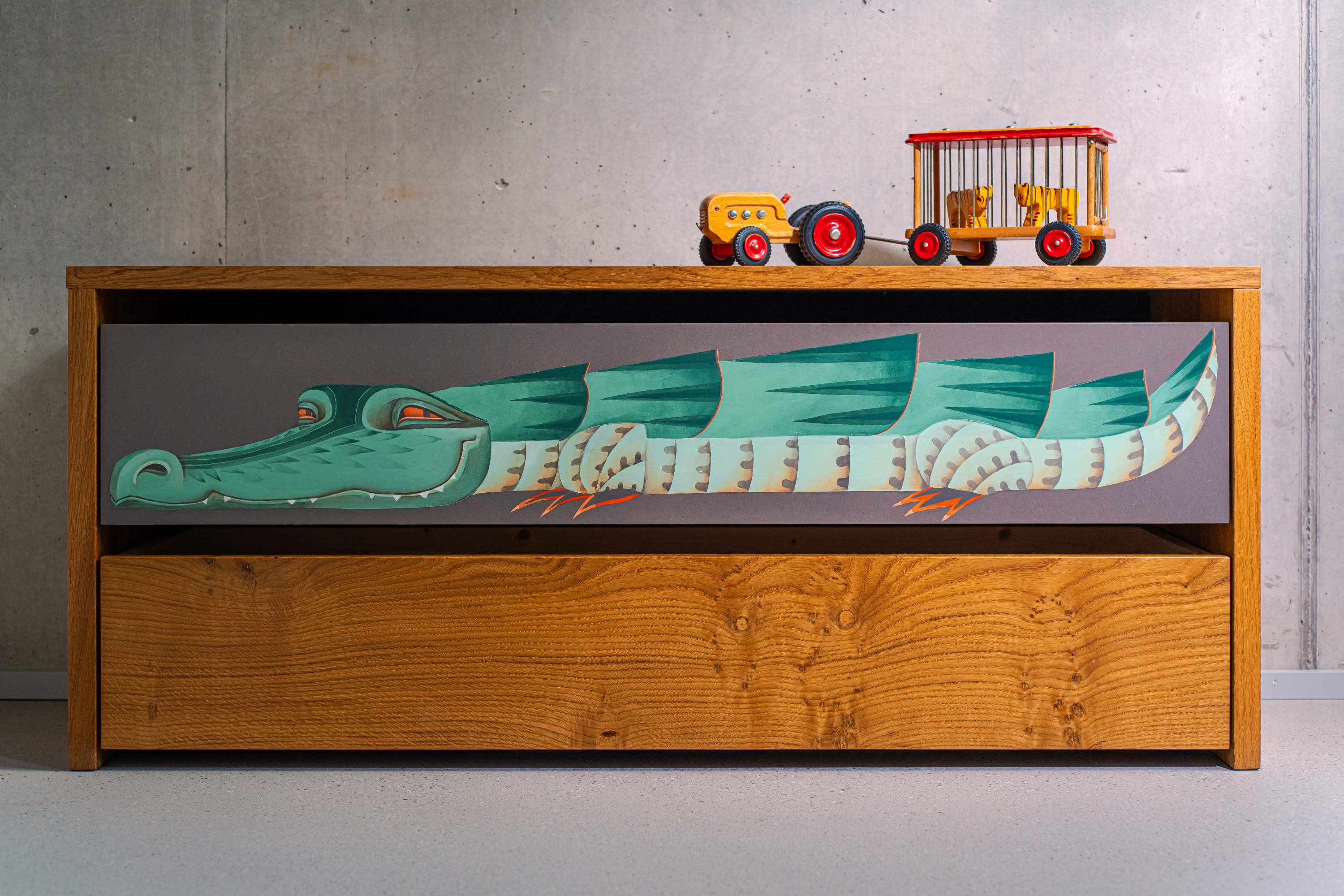 Manche Möbel werden zu ganz besonderen Lieblingsstücken. In Zusammenarbeit mit der in Berlin ansässigen Künstlerin Polina Soloveichik entstehen immer wieder individuell bemalte Fronten. Ob Tiermotive, florale Muster oder ganze Szenen - alles ist möglich.