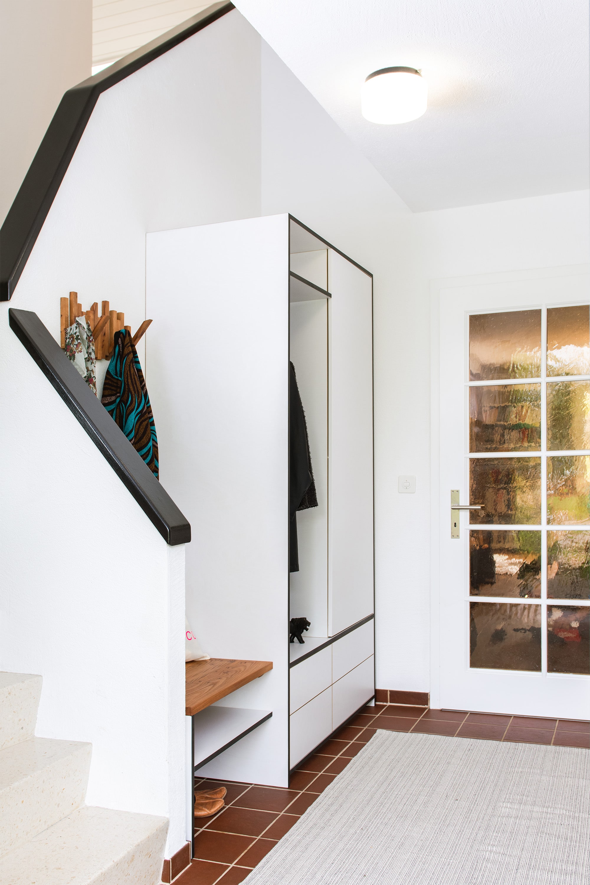 Die Gestaltung dieser Garderobe ist inspiriert von der bestehenden Architektur des Hauses. Die schwarz geölten, gerundeten Kanten nehmen die Elemente des Handlaufes auf.