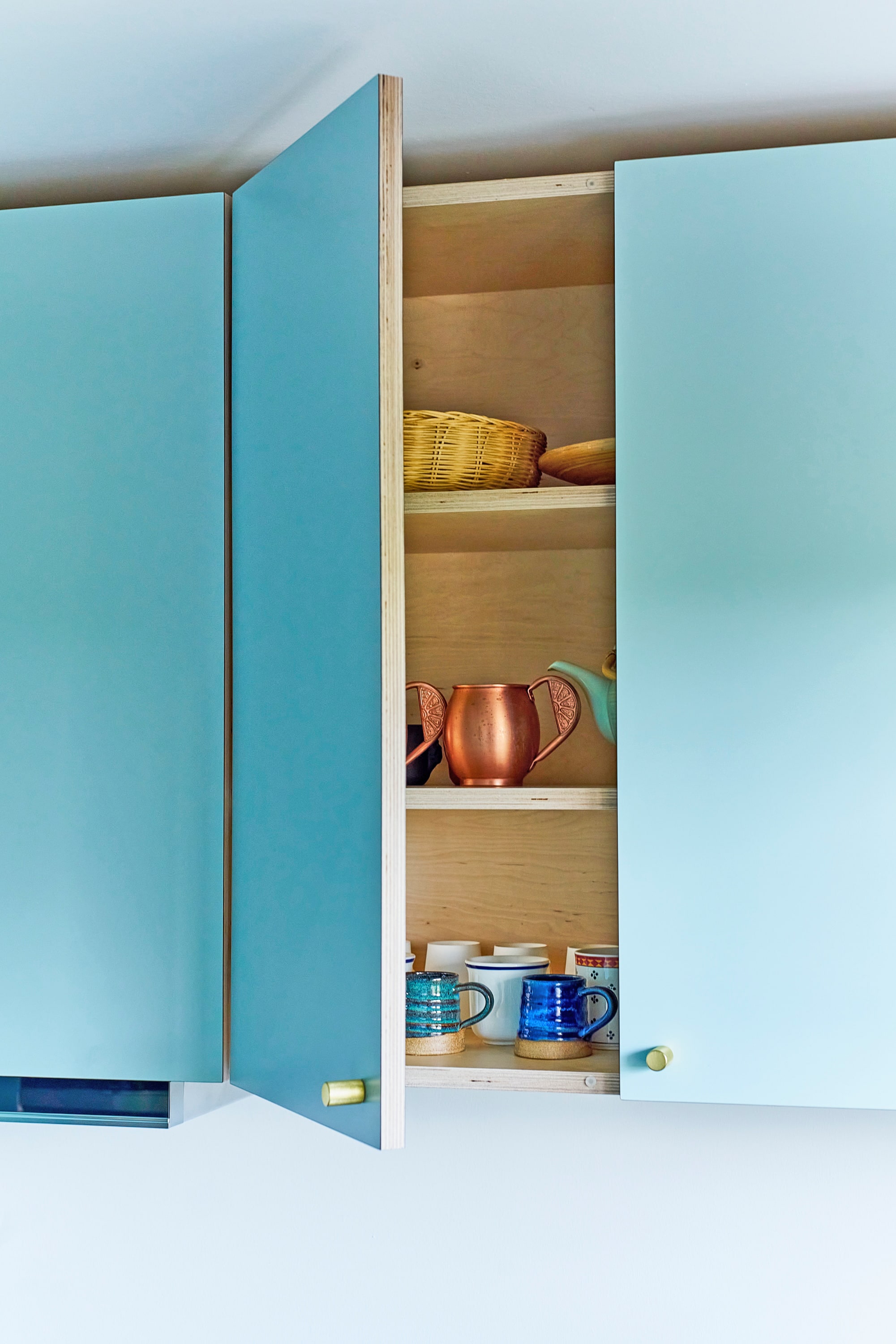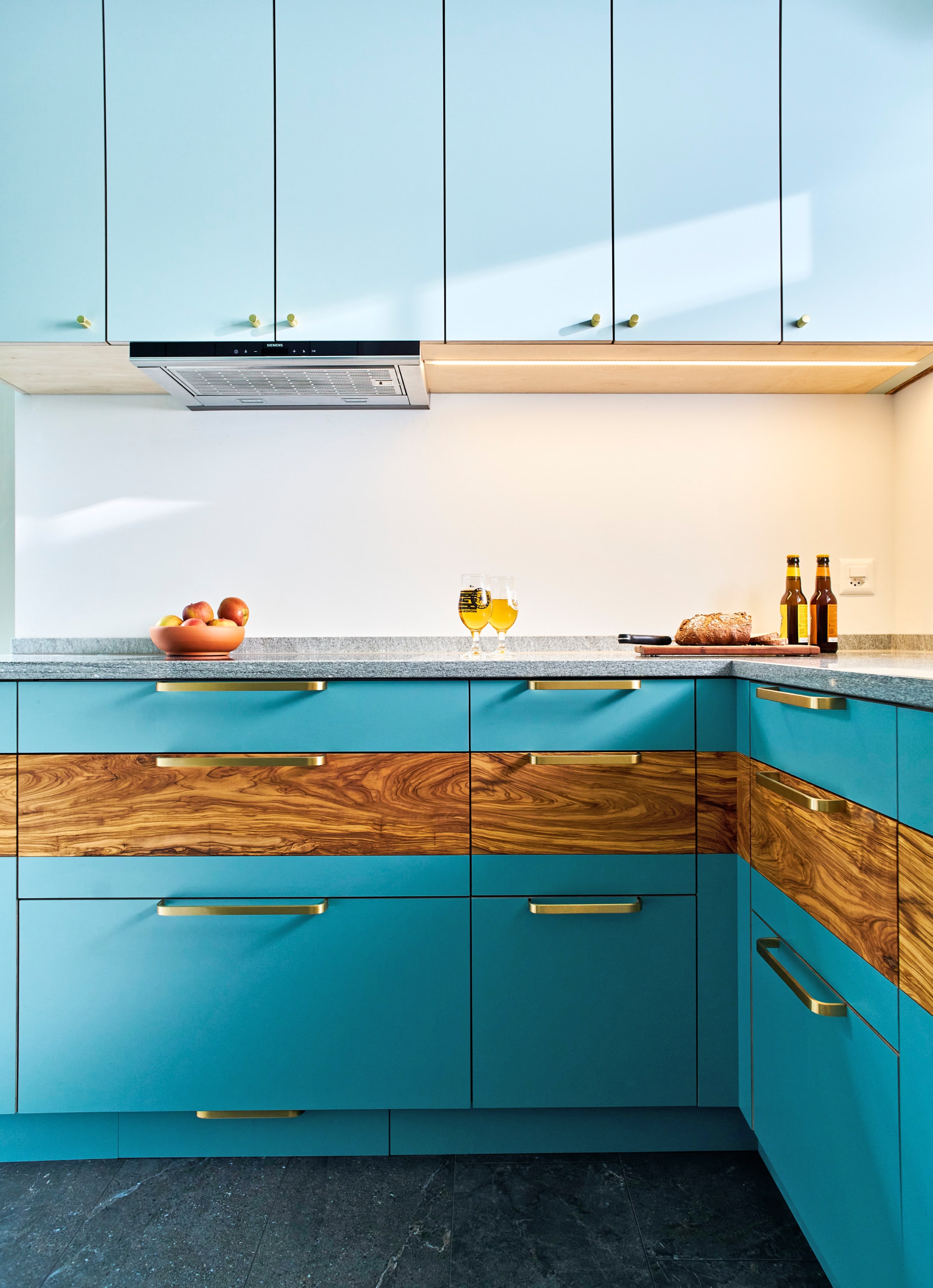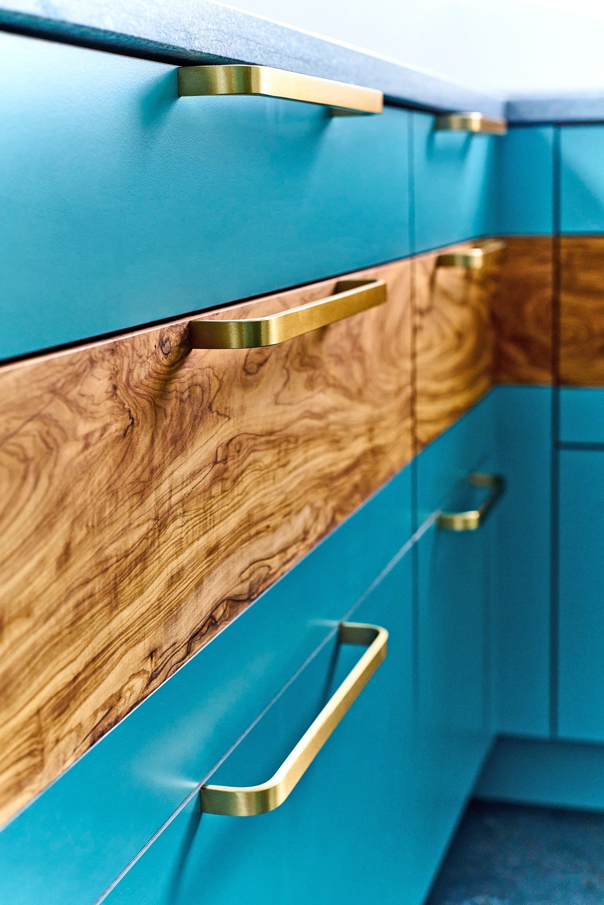 Die Kunstharzfronten in den Farben Wermut und Iguana schaffen eine kühle, klare Atmosphäre. Das durchlaufende Band aus Olivenholz gibt Struktur und Wärme. Die Griffe aus Messing sind oben bündig montiert, um das Bild der Olive nicht zu unterbrechen.